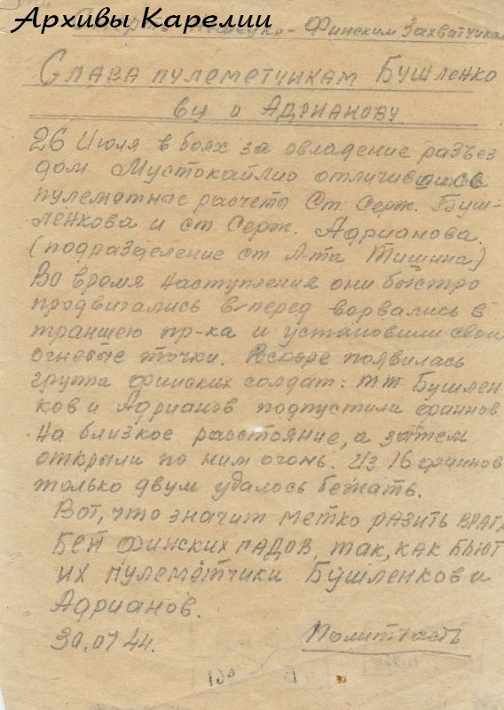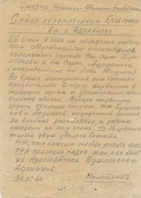 Листовка рукописная''Слава пулеметчикамБушленкову и Адрианову''.30 июля 1944 г.Из фондов КГКМ