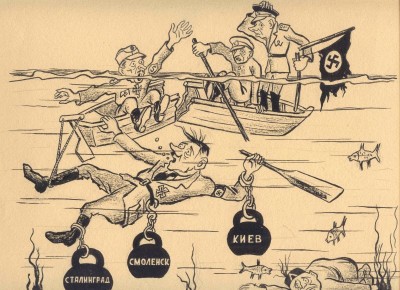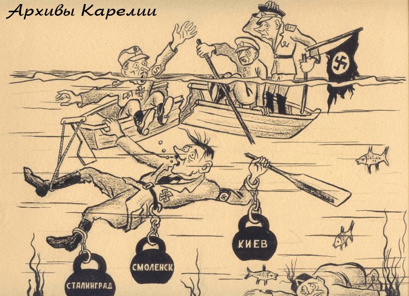 Карикатура''Утопающий Гитлер тянет за собой Финляндию''.1944 г.Автор Буторов К.Л.Из фондов КГКМ