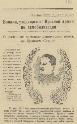 Листовка''О разгроме немецко-фашистских войск на Крайнем Севере'' (материал для проведения бесед среди населения демобилизованными воинами).1944 г.Из фондов КГКМ