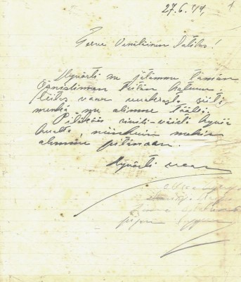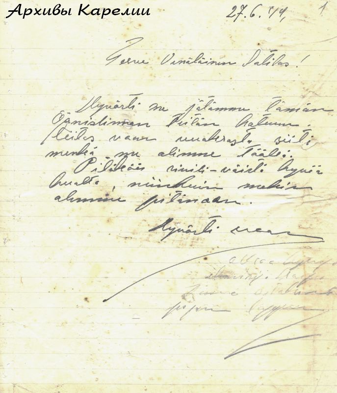 | ''Здравствуй, русский солдат! Мы оставляем Вам Иянислинна... Содержите гражданское население так же хорошо, как содержали мы. Прощайте'' - Обращение финского солдата к русскому солдату, обнаруженное в день освобождения г. Петрозаводска. 27 июня 1944 г. Из фондов НА РК
